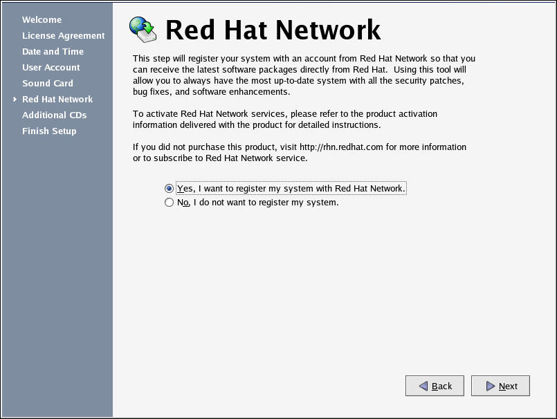 To register your system with Red Hat Network and receive automatic updates of your Red Hat Enterprise Linux system, choose Yes, I would like to register my system with Red Hat Network. This will start the Red Hat Update Agent — a utility that guides you step-by-step through the registration of your machine with Red Hat Network. Selecting No, I do not want to register my system skips the registration. For more information about Red Hat Network and registering your machine, refer to the Red Hat Network documentation at http://www.redhat.com/docs/manuals/RHNetwork/.
