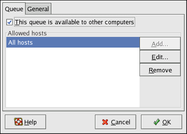 After selecting to share the queue, by default, all hosts are allowed to print to the shared printer. Allowing all systems on the network to print to the queue can be dangerous, especially if the system is directly connected to the Internet. It is recommended that this option be changed by selecting the All hosts entry and clicking the Edit button to display the window shown in Figure 36-18.