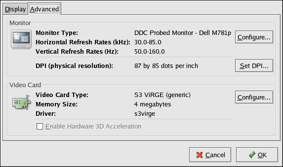 To configure your monitor manually, click the Advanced tab, then click the Configure... button next to the Monitor Type entry. A pop-up window displays a list of monitor models. Choose your model and click OK. You can also let the X Configuration Tool probe your monitor for the correct model and vertical/horizontal frequency settings.