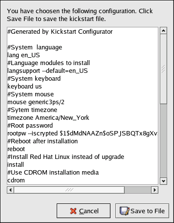 To save the kickstart file, click the Save to File button in the preview window. To save the file without previewing it, select File => Save File or press [Ctrl]-[S]. A dialog box appears. Select where to save the file.