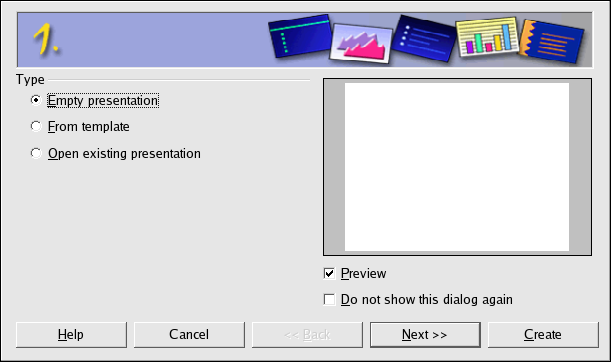OpenOffice.org Impress features a step-by-step automated presentation wizard called AutoPilot that allows you to create presentations from a collection of default style templates. You can make slides with itemized lists, outlines, or images. You can even import charts and graphs created by OpenOffice.org Calc into a slide.