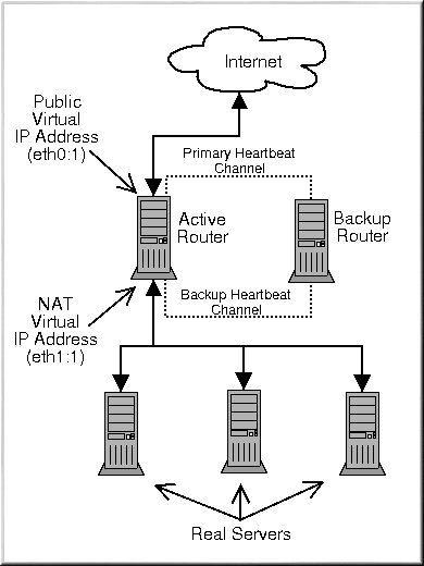 In the example, there are two NICs in the active LVS router. The NIC for the Internet has a real IP address on eth0 and has a floating IP address aliased to eth0:1. The NIC for the private network interface has a real IP address on eth1 and has a floating IP address aliased to eth1:1. In the event of failover, the virtual interface facing the Internet and the private facing virtual interface are taken-over by the backup LVS router simultaneously. All of the cluster's real servers located on the private network use the floating IP for the NAT router as their default route to communicate with the active LVS router so that their abilities to respond to requests from the Internet is not impaired.