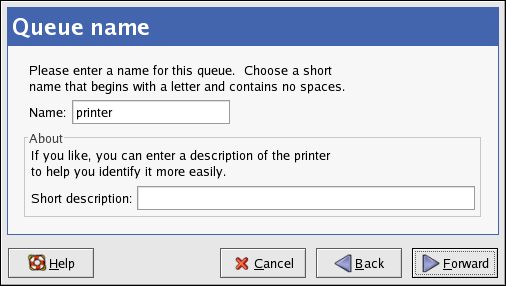 In the window shown in Figure 24-3, enter a unique name for the printer in the Name text field. The printer name cannot contain spaces and must begin with a letter. The printer name may contain letters, numbers, dashes (-), and underscores (_). Optionally, enter a short description for the printer, which can contain spaces.