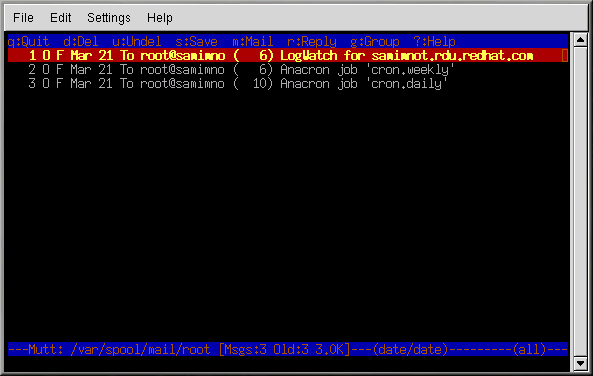 When you launch mutt (by typing mutt at a shell prompt), a screen appears with a list of email messages. This initial menu is called the index.