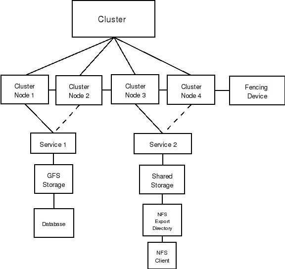 The cluster is comprised of cluster nodes. The cluster nodes are connected to a fencing device. Nodes can be separated by failover domains to a cluster service. The services are comprised of managed resources, such as NFS exports, IP addresses, and shared GFS partitions. The structure is ultimately reflected in the /etc/cluster/cluster.conf XML structure.