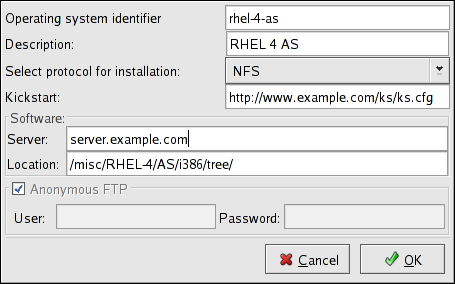 Operating system identifier — Provide a unique name using one word to identify the Red Hat Enterprise Linux version and variant. It is used as the directory name in the /tftpboot/linux-install/ directory.
