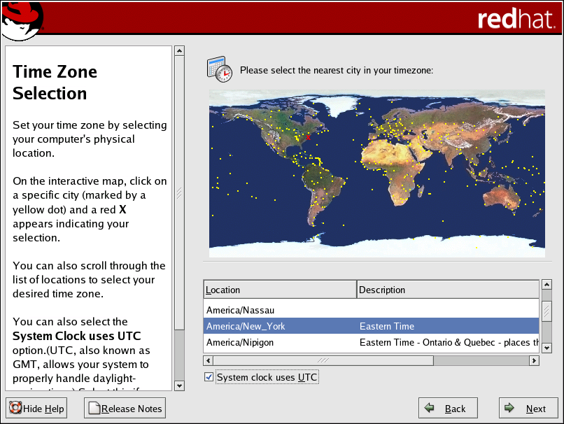 To change your time zone configuration after you have completed the installation, use the Time and Date Properties Tool. Type the system-config-date command in a shell prompt to launch the Time and Date Properties Tool. If you are not root, it prompts you for the root password to continue. To run the Time and Date Properties Tool as a text-based application, use the command timeconfig. |